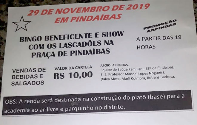 A associação Arpindas irá realizar na noite dessa sexta-feira (29) um bingo beneficente no distrito. A renda será toda revertida para a construção da base onde será colocada uma academia ao ar livre e um parquinho para crianças. A premiação do bingo será em dinheiro e também serão vendidas comidas e bebidas no local. O show ficará por conta de Hélio e Júnior Os Lascadões.