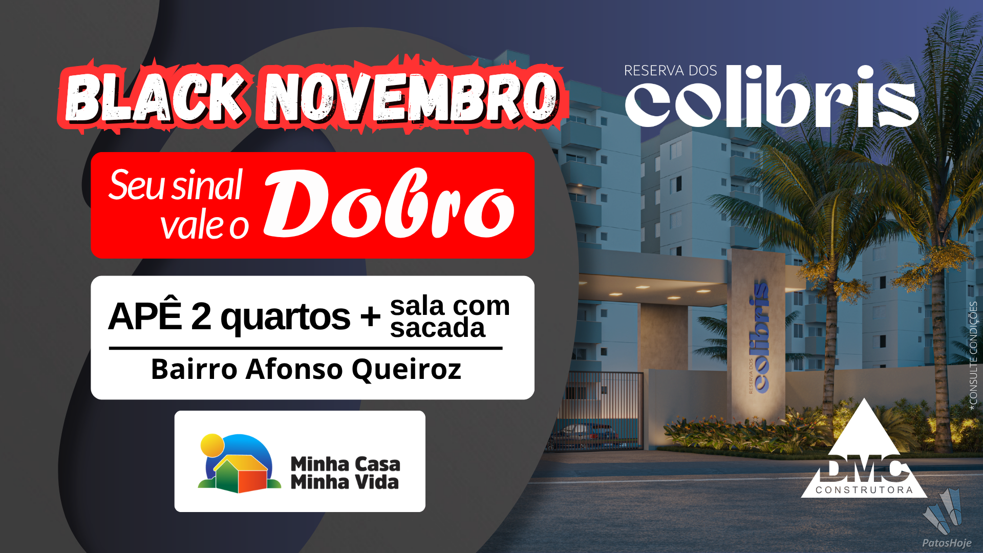 Com a Black Novembro DMC, o valor do seu sinal vale o dobro para garantir seu apartamento no Reserva dos Colibris, o mais novo sucesso da DMC no bairro Afonso Queiroz — mais de 100 unidades vendidas em menos de dois meses.