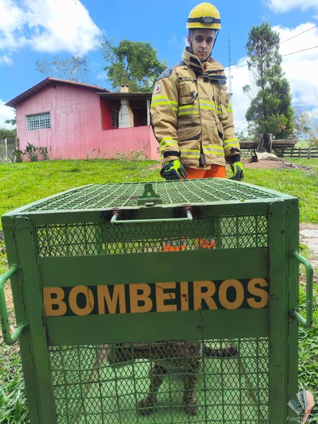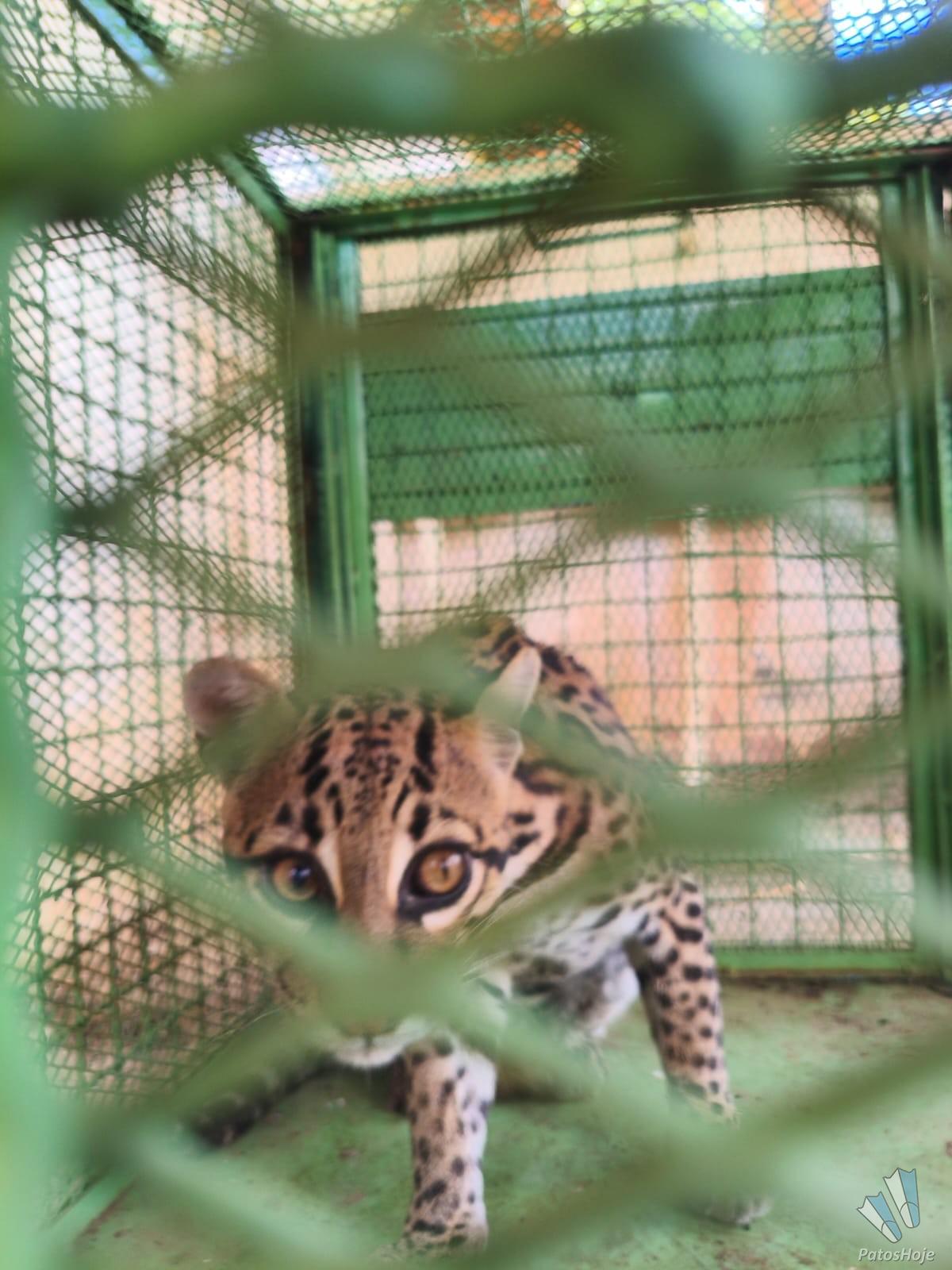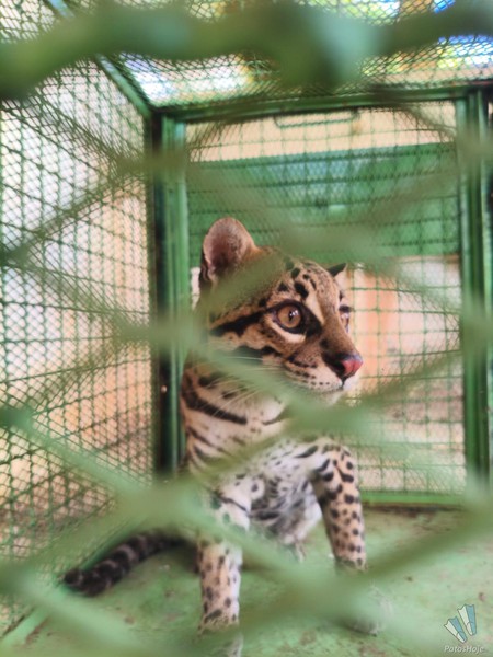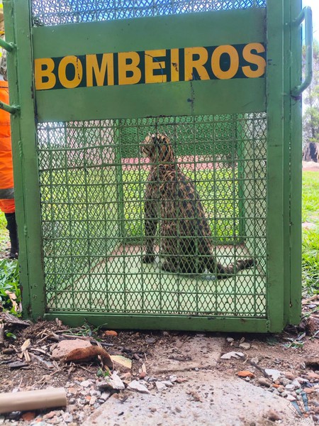 Jaguatirica foi contida em um cômodo da construção abandonada. Com a chegada da guarnição, equipada com roupa de proteção e cambão, ela foi contida e colocada em gaiola apropriado para o transporte.