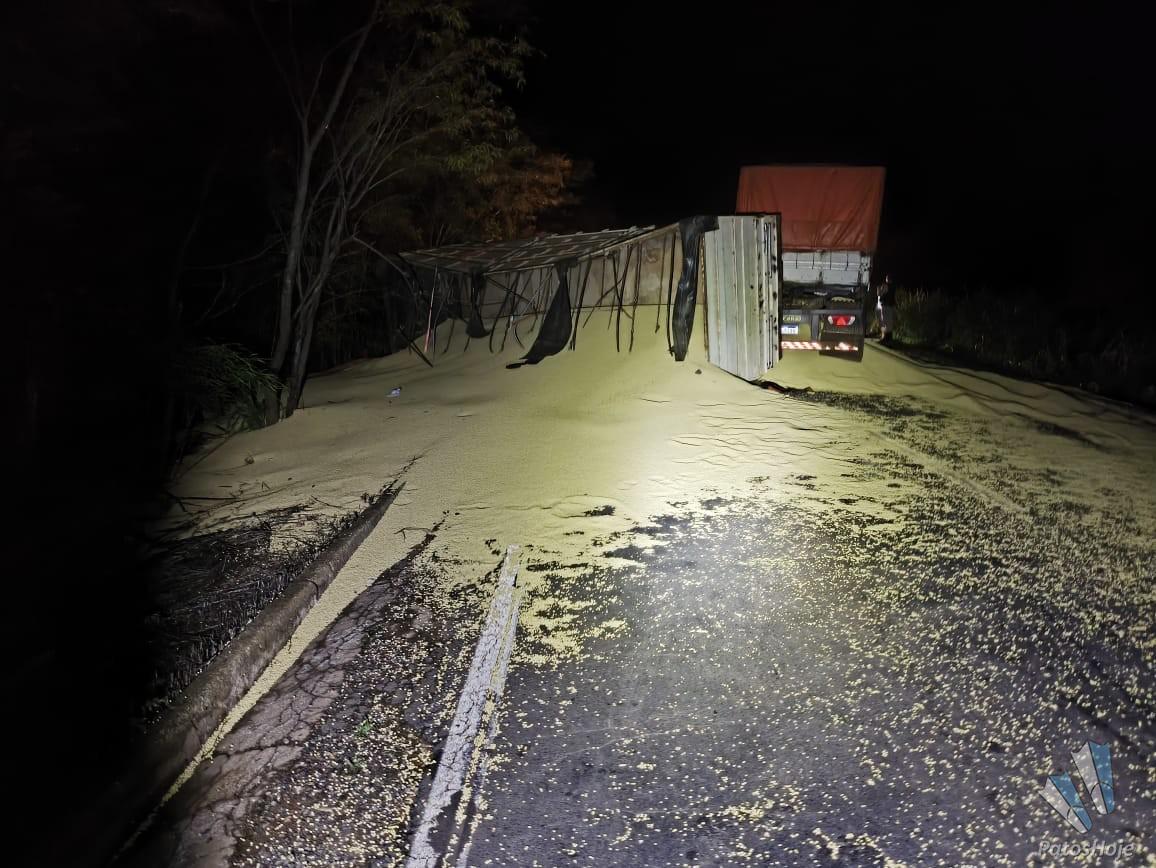 Um caminhão carregado com soja a granel acabou tombando, após apresentar uma falha mecânica, na noite desta quinta-feira (18), no km24, da MG410, em Presidente Olegário. A carga ficou espalhada pela pista e interditou totalmente a via. Felizmente, ninguém se feriu.