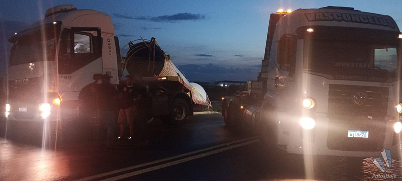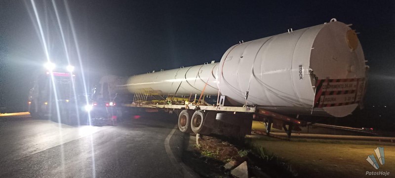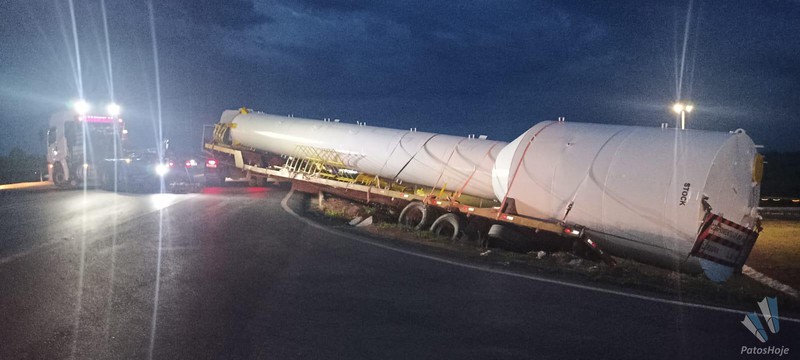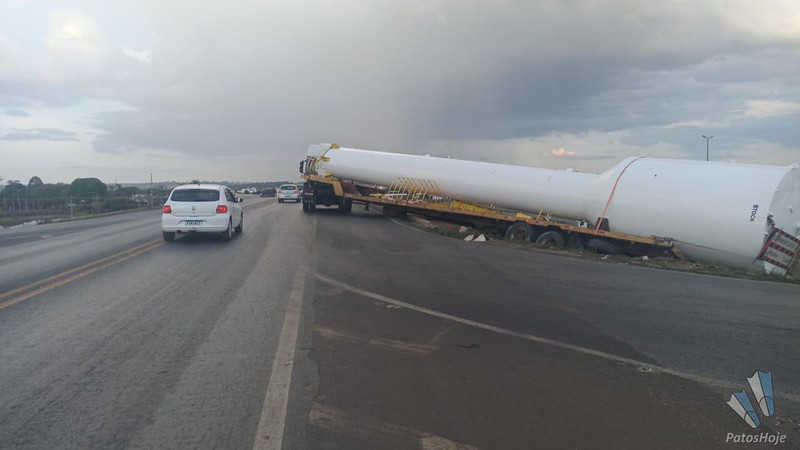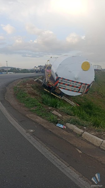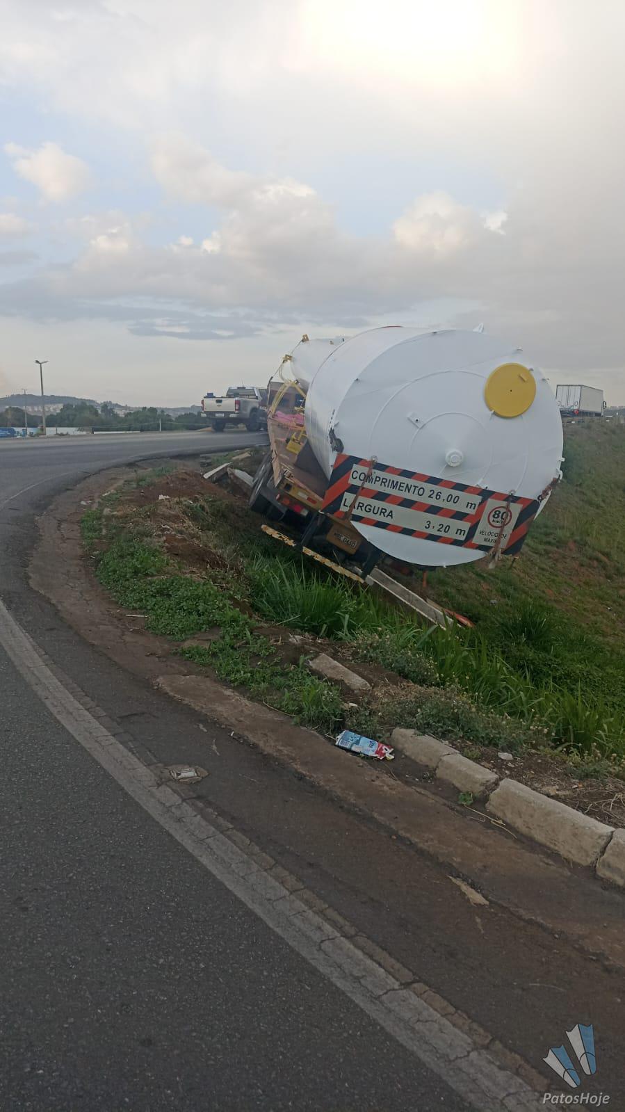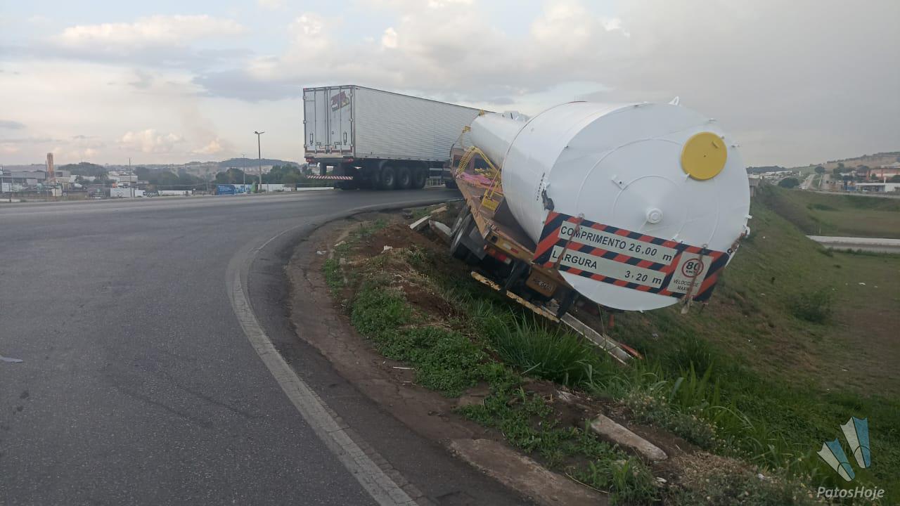 Mais um acidente envolvendo veículo de carga nas rodovias da região. No final da tarde desta quinta-feira (16), uma carreta que transportava uma caixa d’água enorme foi parar fora da pista quando fazia a alça do viaduto no Trevo da Pipoca, em Patos de Minas. A pista teve que ser interditada.