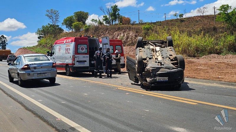 Um carro parou com as rodas para cima em um acidente na MGC354, entre o Trevo da Escola Agrícola e o Pesque e Pague São Gabriel, em Patos de Minas, na manhã desta sexta-feira (26). O motorista de 69 anos ficou ferido e foi socorrido pelo SAMU. A suspeita é de que o condutor tenha passado mal, antes de bater em um barranco.