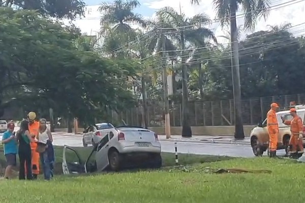 Moto pega fogo após colisão com carro e dois ficam feridos na Avenida Brasil, em Patos de Minas
