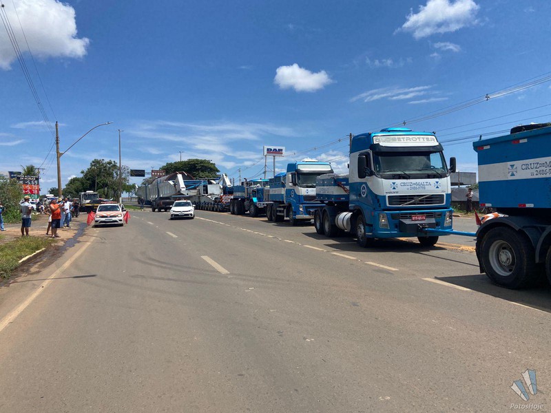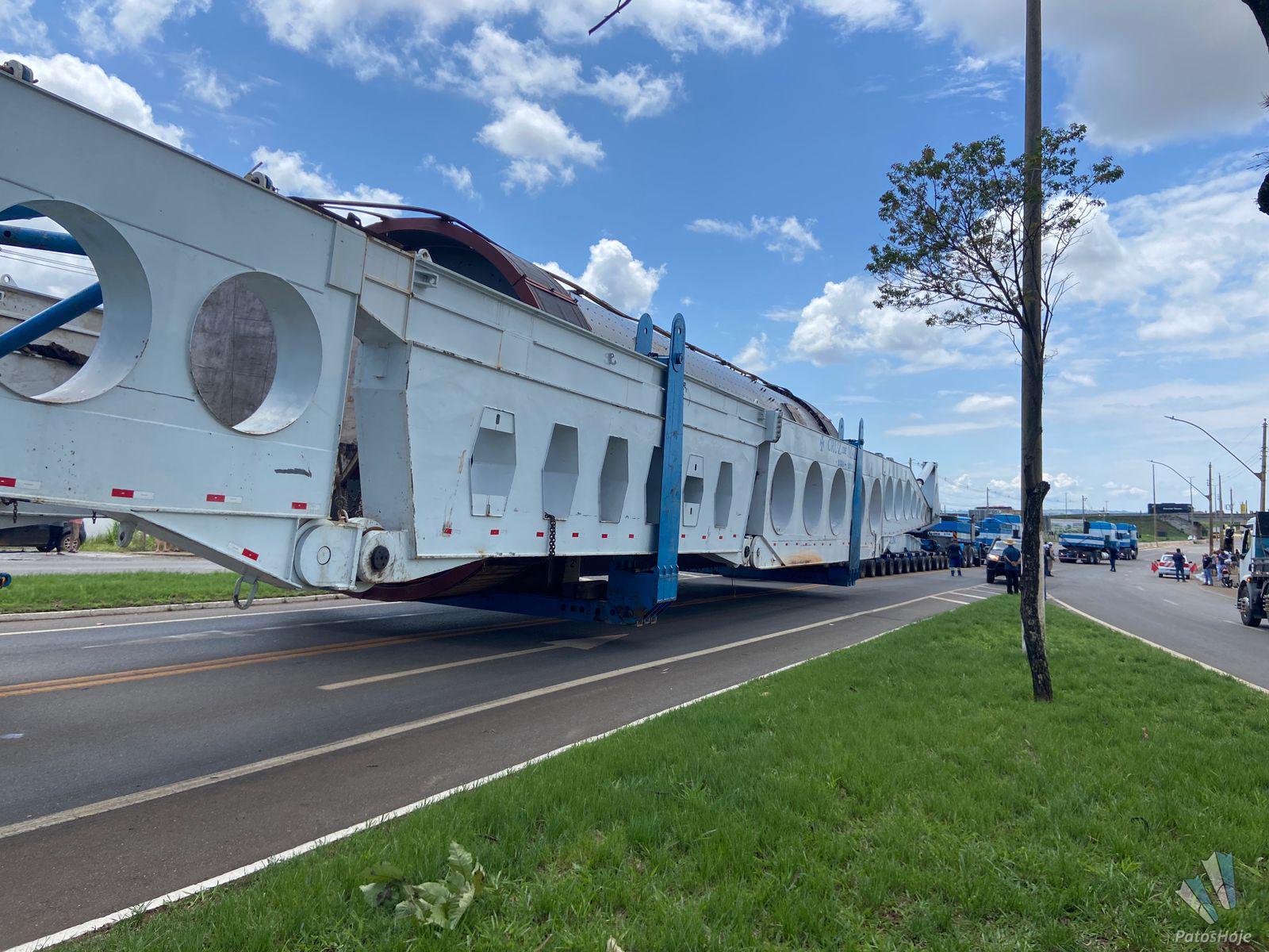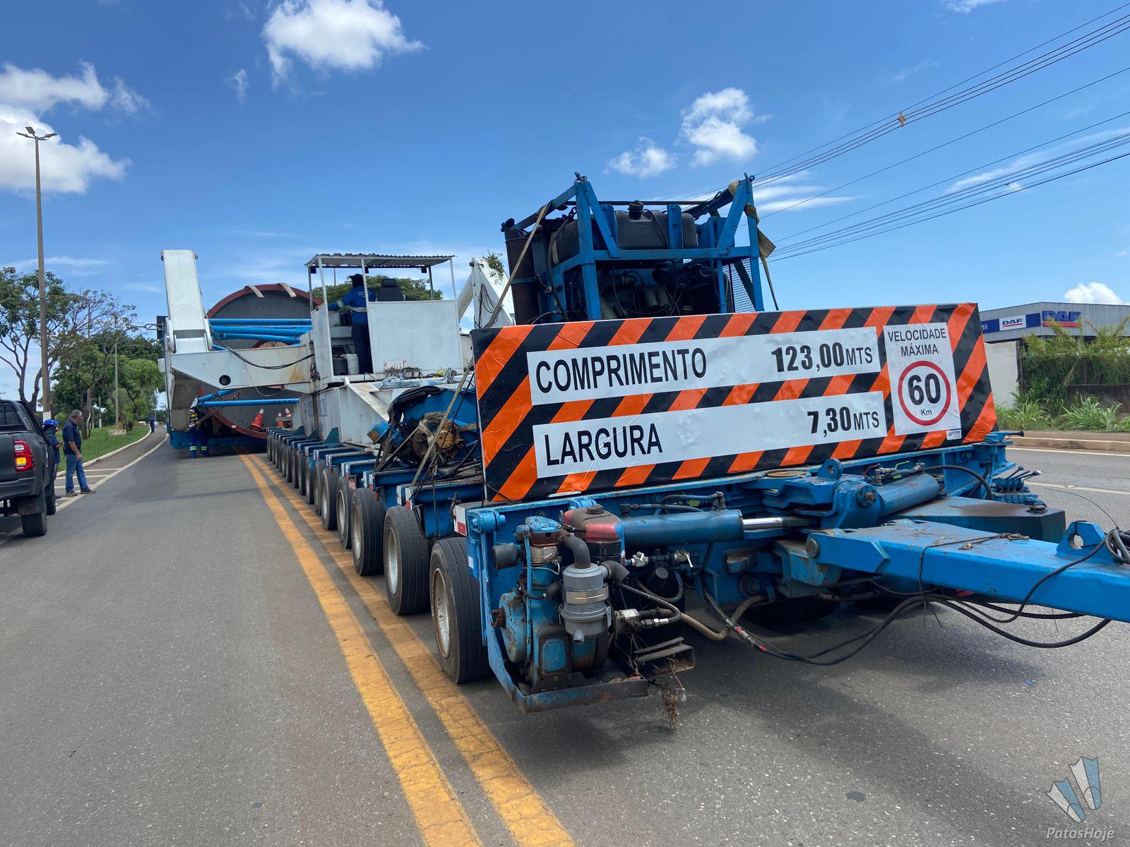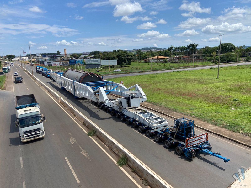 O comboio que transporta um sistema de moagem de quase 640 toneladas passou pelo Trevo da Pipoca, entroncamento da BR352 com a BR365, em Patos de Minas, na manhã desta terça-feira (02). A cena atraiu várias pessoas que acompanharam a manobra no viaduto. A carga está sendo transportada para a cidade de Edealina, município do Goiás.