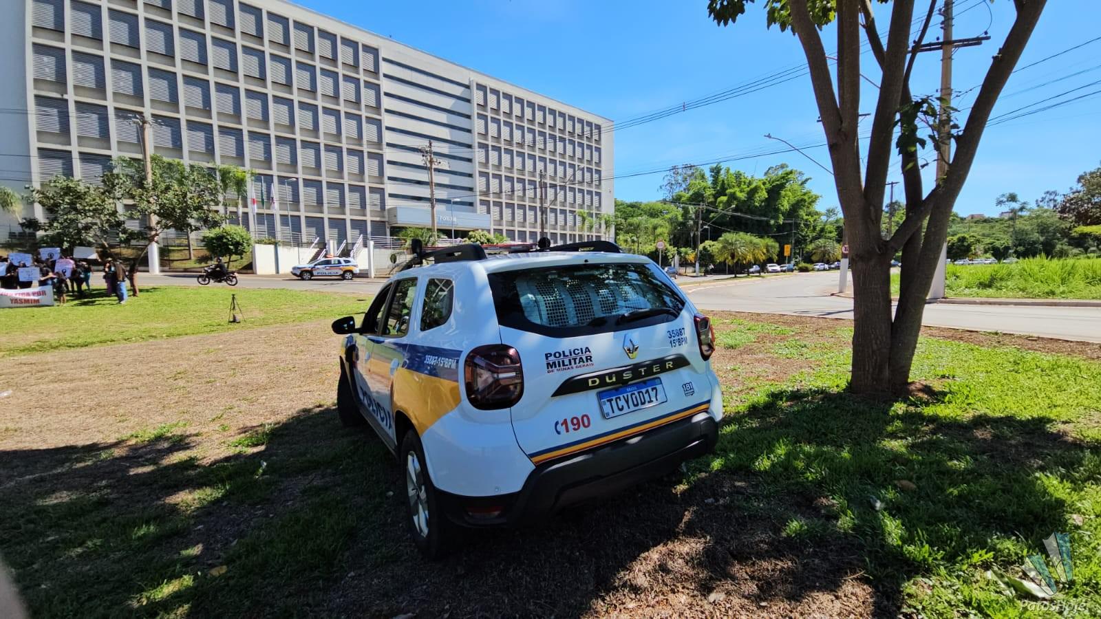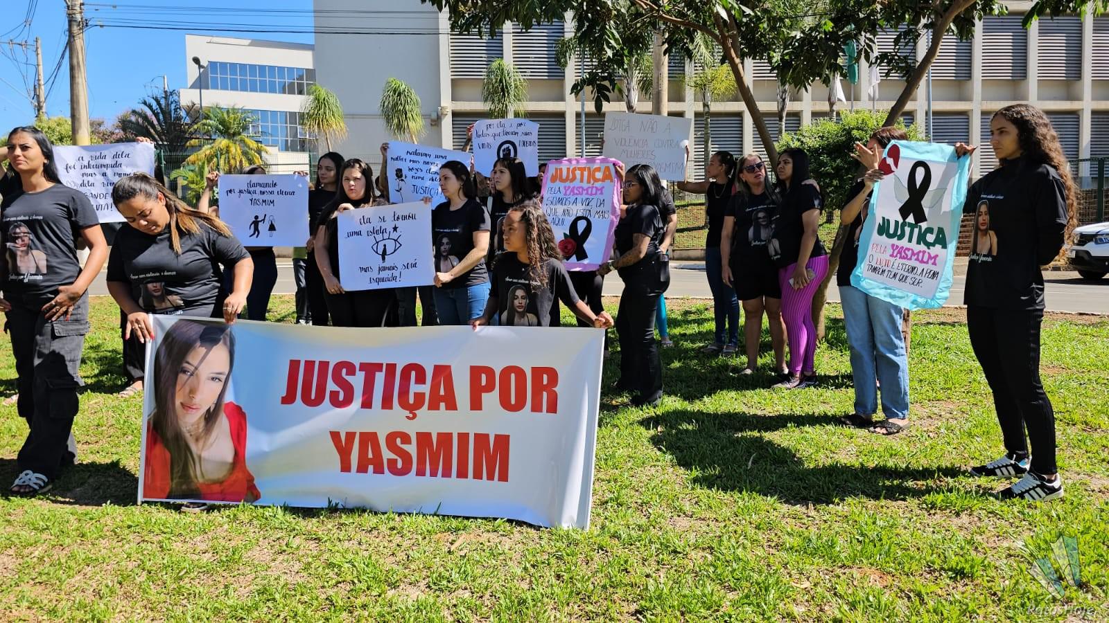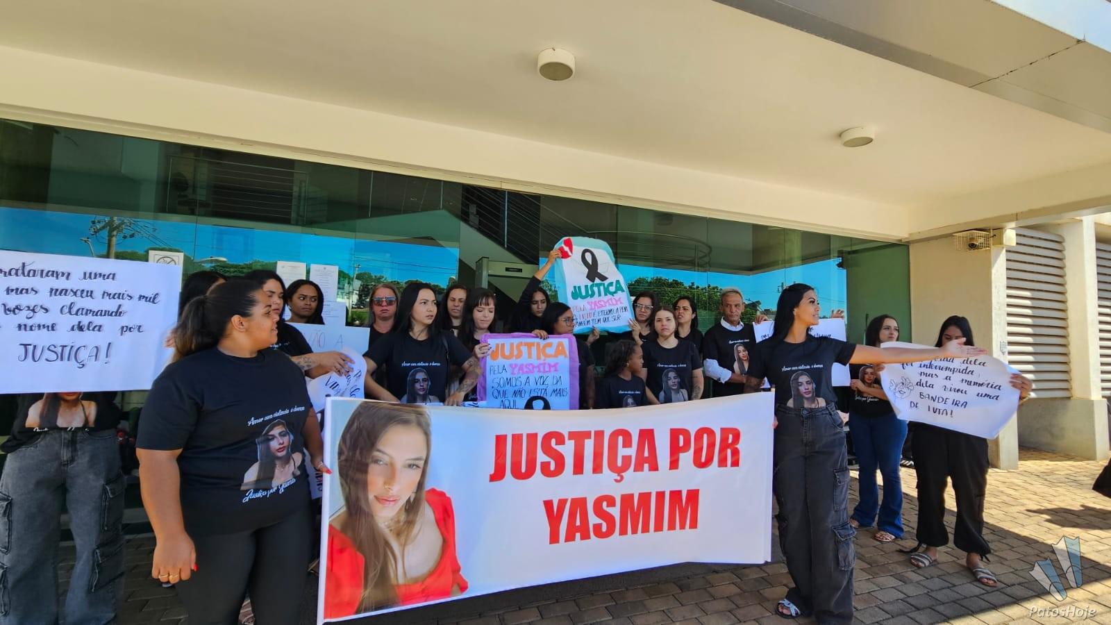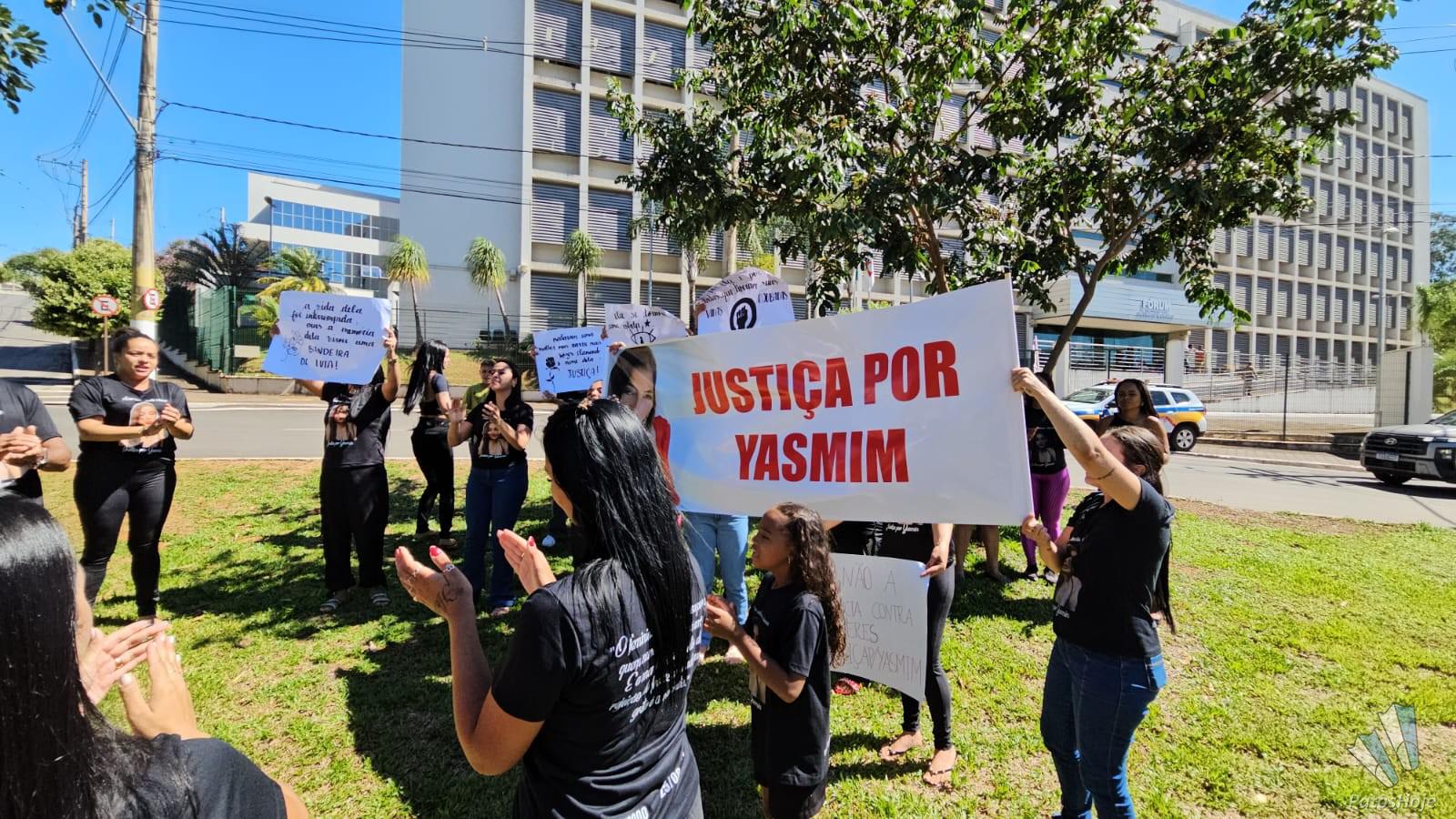 Familiares e amigos de Yasmin Araújo Castro e Silva, de 23 anos, realizam uma manifestação na porta do Fórum Olympio Borges, em Patos de Minas, na manhã desta quarta-feira (19). Com faixas, cartazes e camisetas personalizadas, eles pedem Justiça no julgamento de Mauro Vinícius Expedito Silva, de 25 anos, acusado de matar a jovem a tiros na frente da filha do casal. O réu será julgado hoje em júri popular.