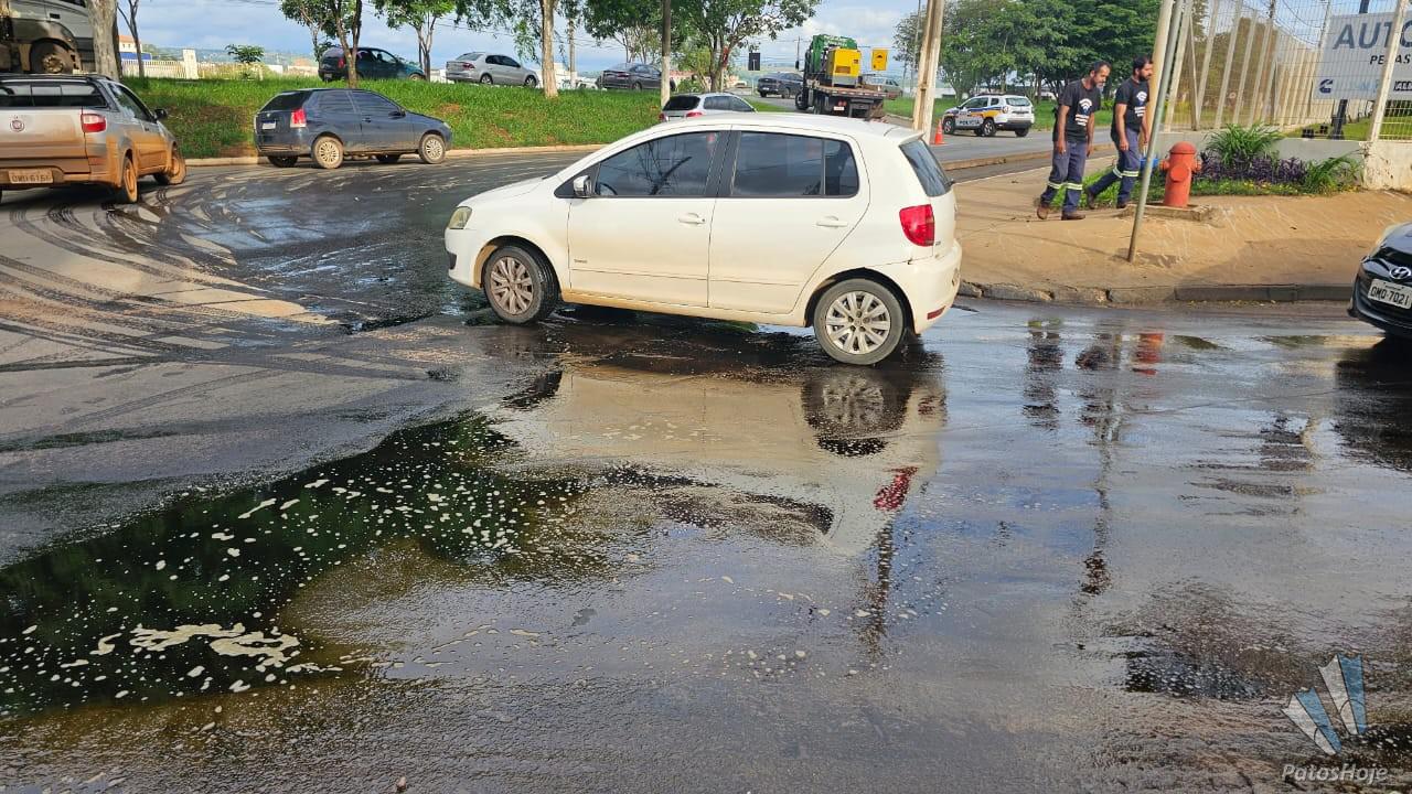 A Polícia Militar isolou o trânsito na pista lateral da avenida JK. A carreta espalhou óleo diesel por toda a extensão do quarteirão e deixou o local bastante escorregadio.