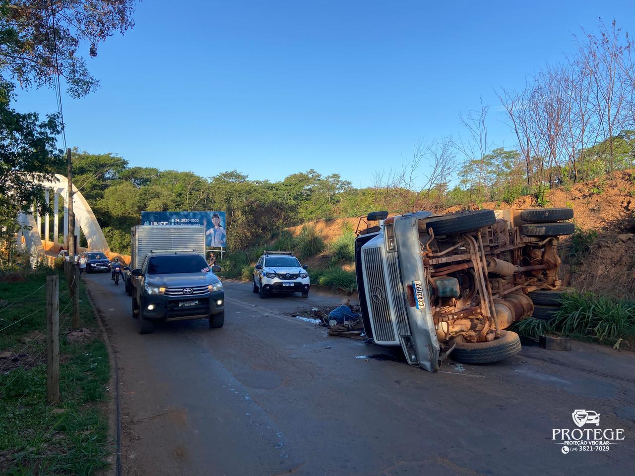 Um caminhão carregado com entulhos tombou nas imediações da chamada Ponte do Arco, sobre o Rio Paranaíba, nos fundos do bairro Nossa Senhora Aparecida, em Patos de Minas. O motorista, de 63 anos, ficou ferido e precisou ser socorrido pelo SAMU. O acidente deixou o trânsito lento nos dois sentidos. A suspeita é que o motorista tenha passado mal.