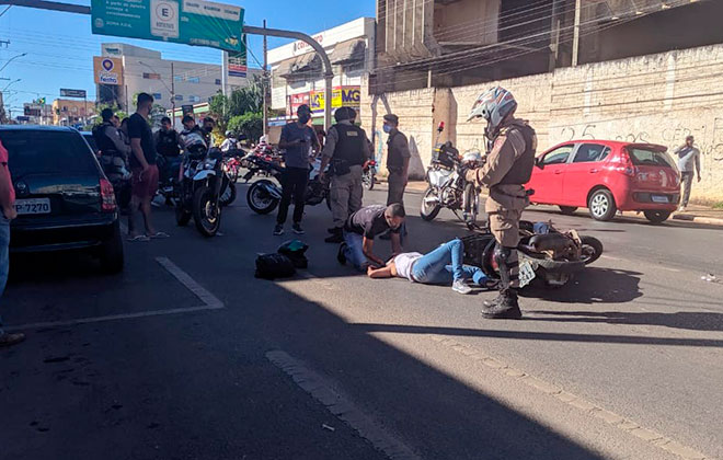 Várias viaturas foram empenhadas e montaram um cerco para fazer a mulher parar a motocicleta. Ela percorreu boa parte da Avenida JK e também da Rua Major Gote ainda sem o capacete. Ela só parou depois de perder o controle da motocicleta e se chocar em um veículo Hyundai/HB20. Ela caiu ao solo e sofreu escoriações. A mulher de 44 anos foi encaminhada para o hospital em uma ambulância do Corpo de Bombeiro que foi escoltada pela Polícia Militar.