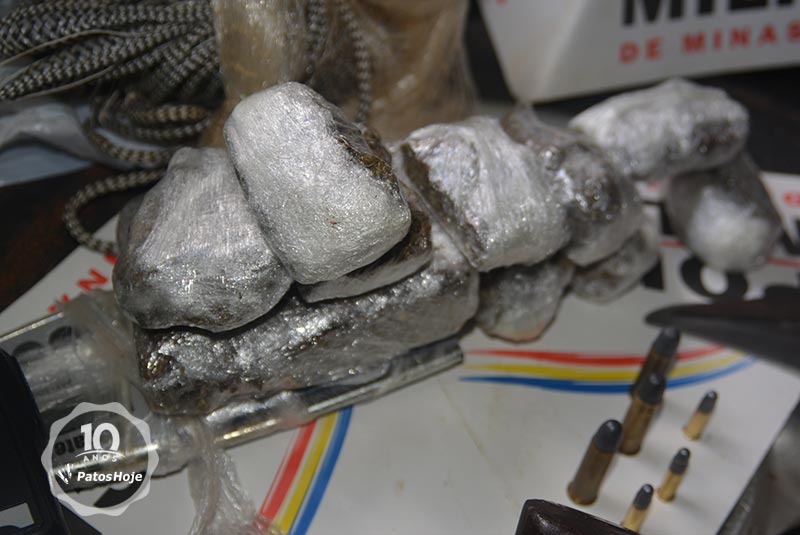 Os policiais encontraram uma arma de fogo calibre .38, uma balança de precisão, um rádio comunicador sintonizado na frequência da PM e uma tarrafa. Além desses materiais, também foram encontrados um tablete grande de maconha e mais nove tabletes menores da mesma droga, três munições de calibre .38 e .22, dois punhais e uma faca com resquícios da droga. Quatro rodas de carro também foram apreendidas.