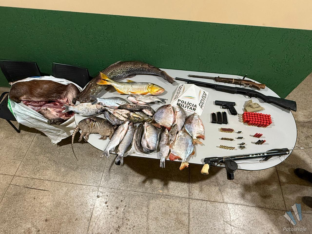 01 espingarda calibre 12, 01 pistola 9mm, 01 espingarda artesanal e centenas de munições de diversos calibres, 02 carregadores 9mm e 01 carregador .40, 01 arbalete/arpão, um tatu e uma capivara abatidos com disparos de arma de fogo, 32,4 kg de pescado fora do tamanho permitido e sem comprovação de origem.