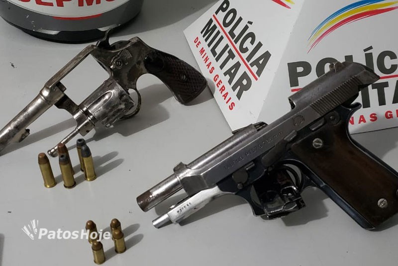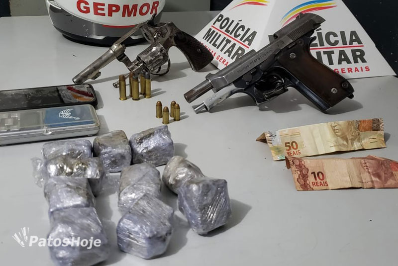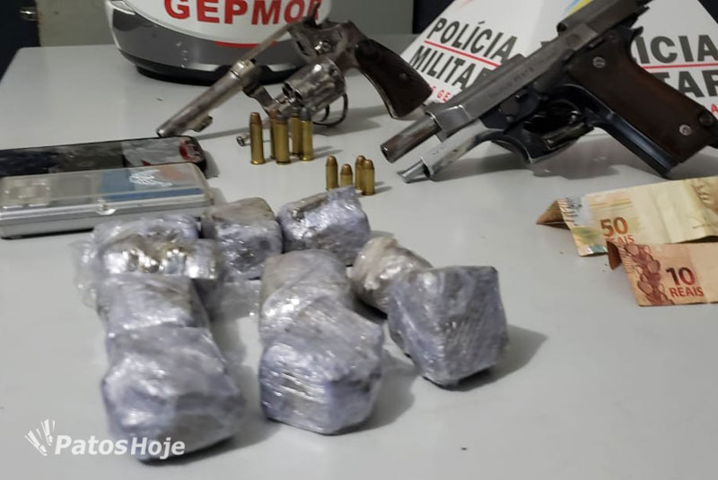 Policiais do GEPMOR apreenderam duas armas de fogo e diversos tabletes de maconha na noite desta quarta-feira (01) durante uma ação no bairro Gramado em Patos de Minas. Um homem foi preso acusado de tráfico de drogas e posse ilegal de arma. Todo o material foi levado para a Delegacia.