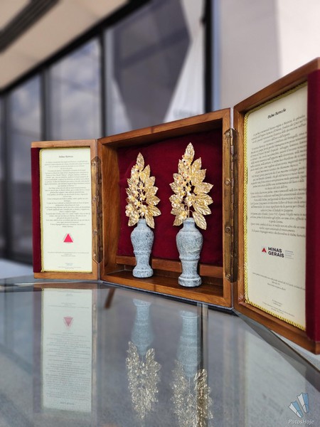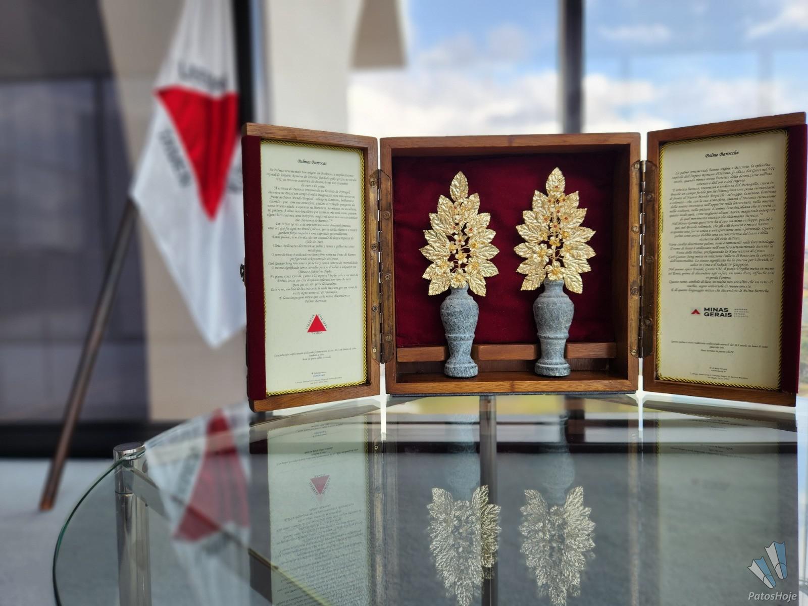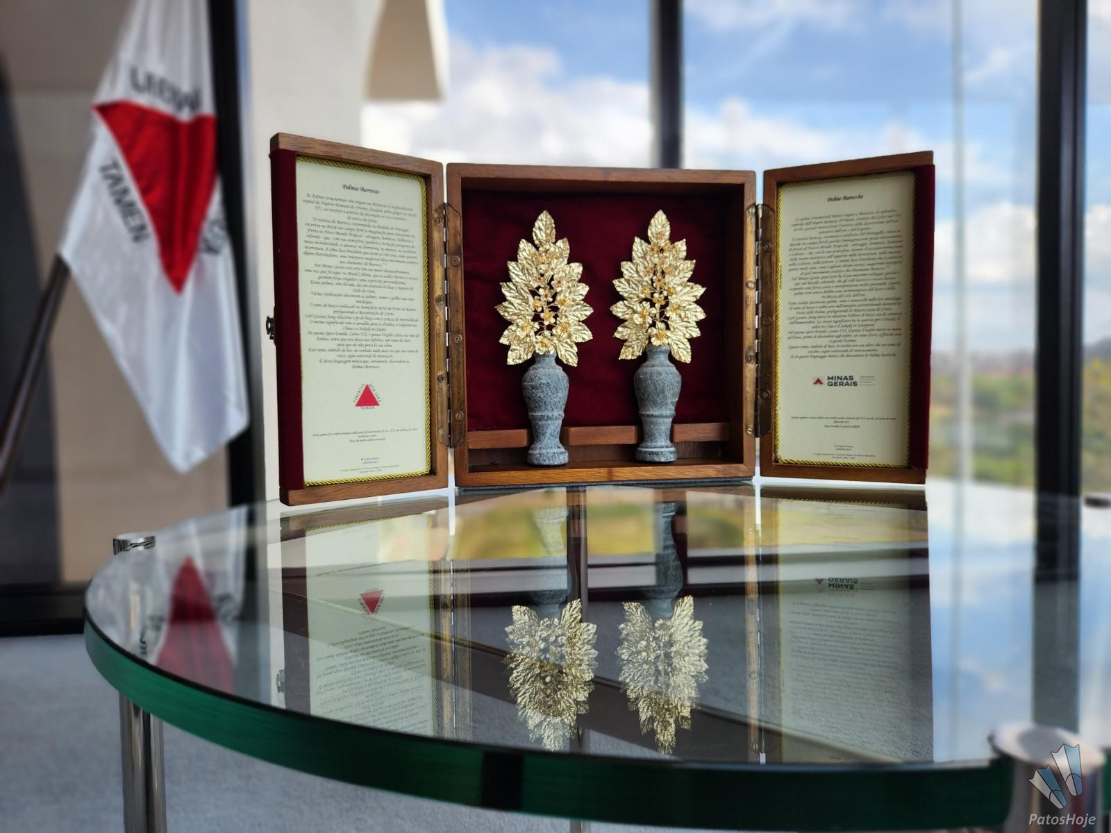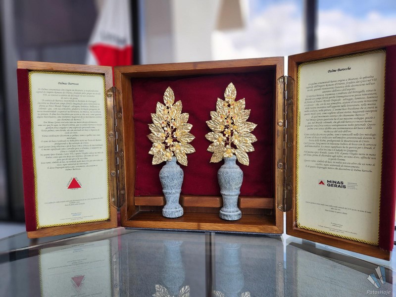 A obra levada pelo governador Romeu Zema ao Vaticano é um par de palmas barrocas assinadas pelo artista George Helt, de 74 anos. Trazidas ao Brasil por Dom João VI, se tornando um item comum na ornamentação de celebrações católicas por todo o país desde o período colonial, as palmas barrocas são adornos tradicionalmente usados para enfeitar altares e oratórios, conhecidas por terem alto grau de manipulação do metal e do ouro para a produção de sofisticados detalhes entalhados nas peças. “Esse trabalho tinha a função de provocar admiração e espanto às pessoas nos espaços sagrados. Por isso, se tornaram tão importantes na cultura barroca”, justifica Helt.