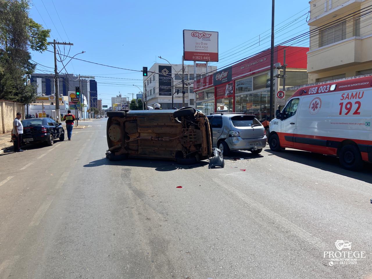Um acidente de trânsito parou a rua Major Gote, no centro de Patos de Minas, na manhã deste domingo (21). Um Corsa/Wind bateu na traseira de um Fiat/Palio e parou tombado no meio da pista. O condutor do Corsa ficou ferido.